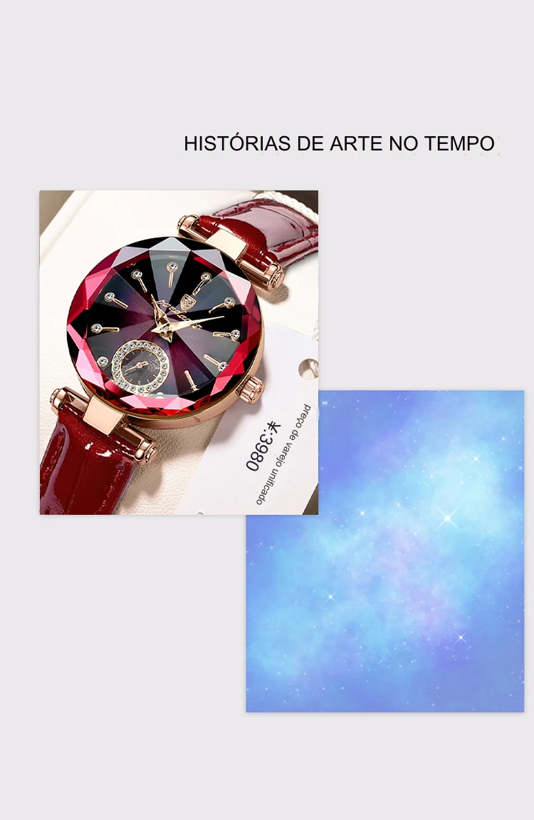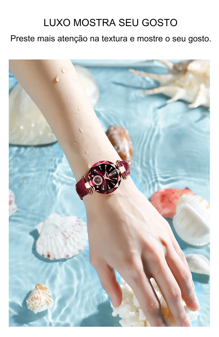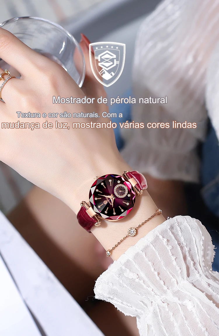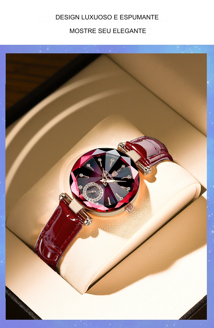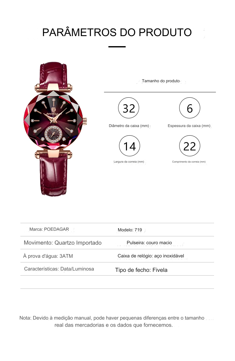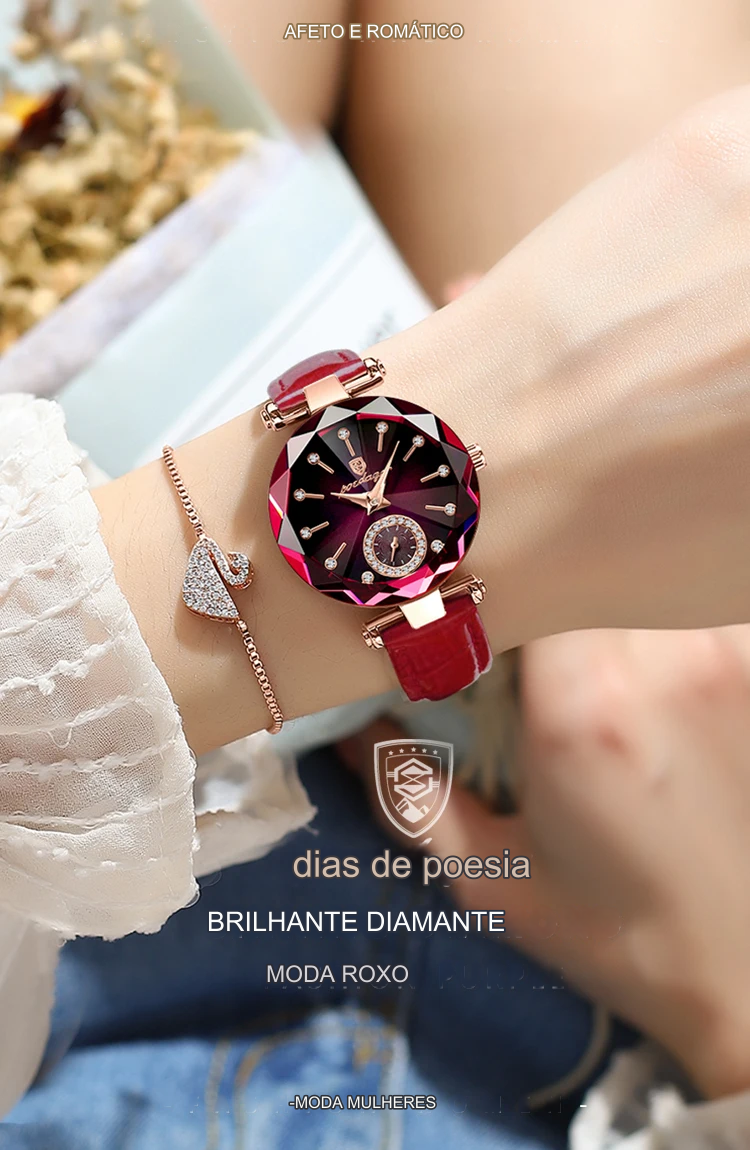 Relógio Feminino Poedagar com Design de Diamante e Pulseira de Couro Vermelho Quartzo